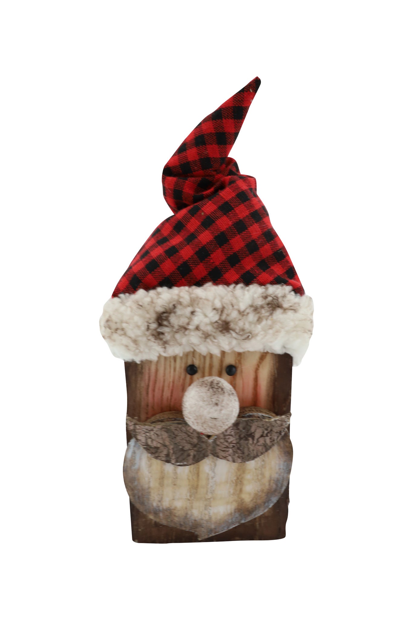 A charming rustic Santa figure crafted from wood, featuring a red plaid hat and faux fur trim. Perfect for adding a warm farmhouse touch to shelves, mantels, or holiday displays.