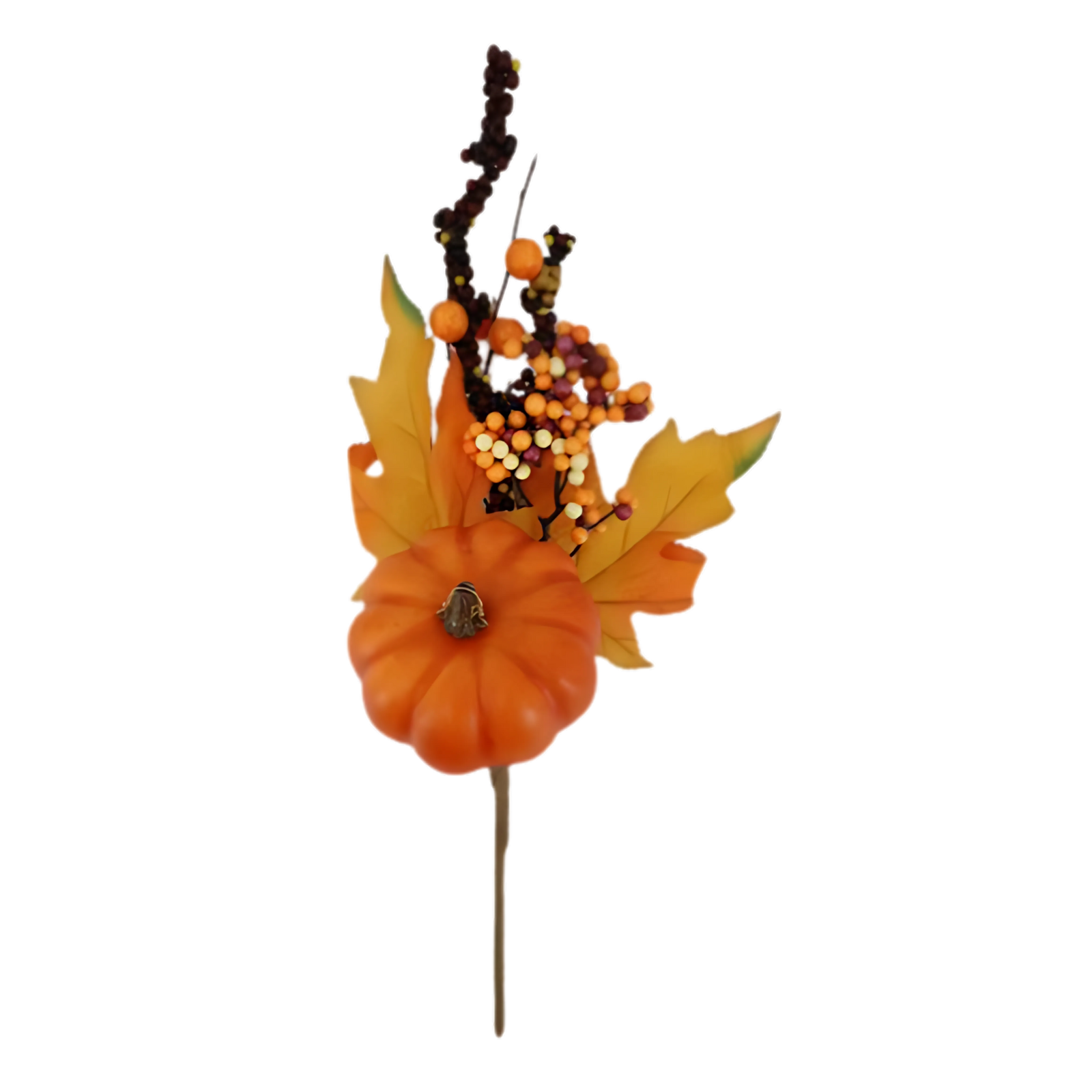 Bring a warm, rustic touch to your seasonal décor with this 15.5-inch pick, featuring a vibrant pumpkin surrounded by clusters of colorful berries and rich maple leaves. Perfect for adding height and texture to arrangements, wreaths, or centerpieces, it captures the charm of fall in every detail. Its lifelike design makes it a timeless addition to your harvest displays.
