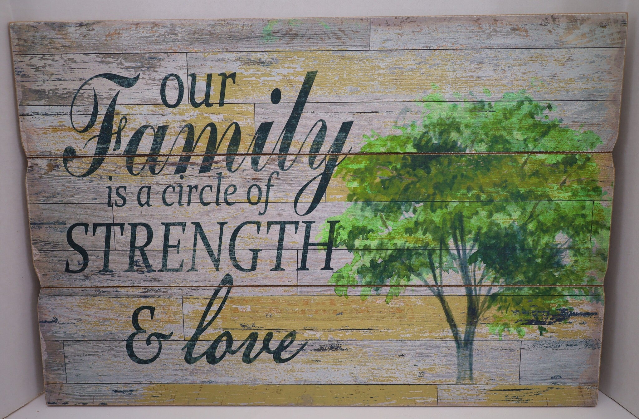 Celebrate the bonds that hold your family together with this heartwarming "Our Family" wall art. Featuring the inspiring message, "Our Family is a circle of strength & love," this piece is the perfect reminder of the unwavering support and affection that family provides. The rustic wood-style background combined with a serene, hand-painted tree creates a charming, nature-inspired design. Ideal for a living room, dining area, or family room, this wall hanging adds warmth and meaning to your home decor.