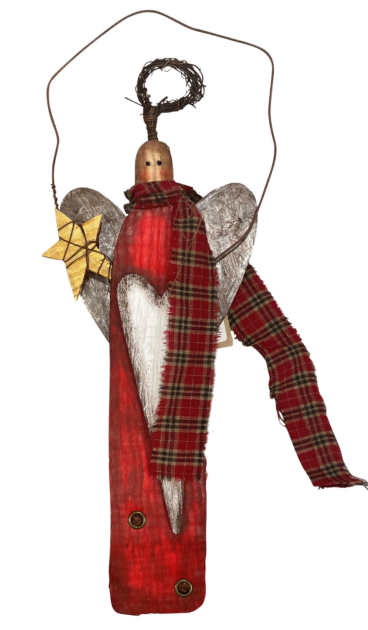This tall rustic wood angel is designed for hanging and features a distressed red body, silver wings, and a plaid scarf for a cozy holiday look. Accented with a golden star and heart detail, it adds a warm, festive touch to walls, doors, or entryways.