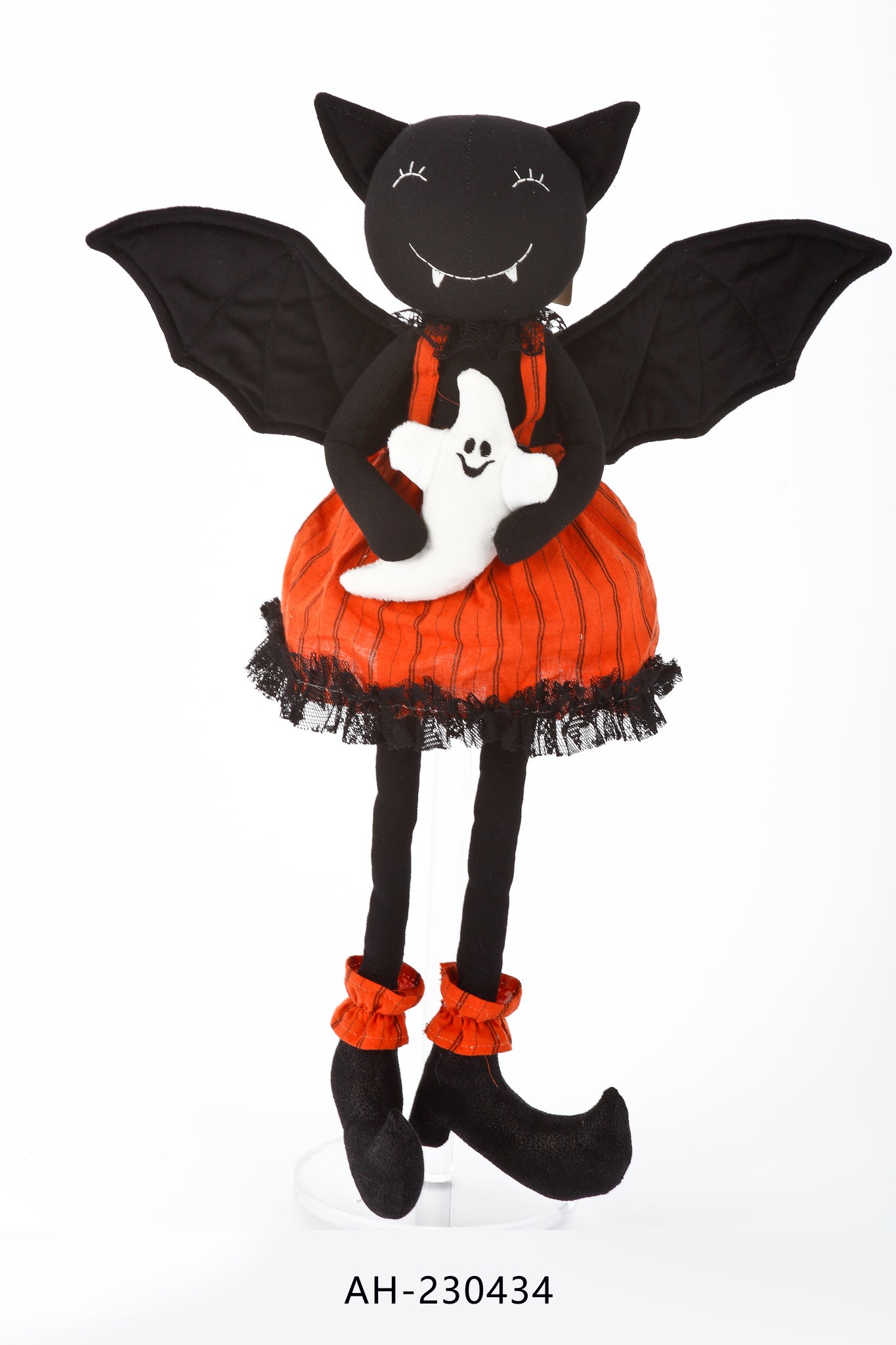 Bring festive charm to your Halloween decor with this adorable 22" bat figure, featuring oversized wings, a striped orange skirt, and a friendly ghost plush. With playful details and soft fabric construction, this standing figure is perfect for tabletops, mantels, or seasonal vignettes. A sweet and spooky addition to any Halloween setup!