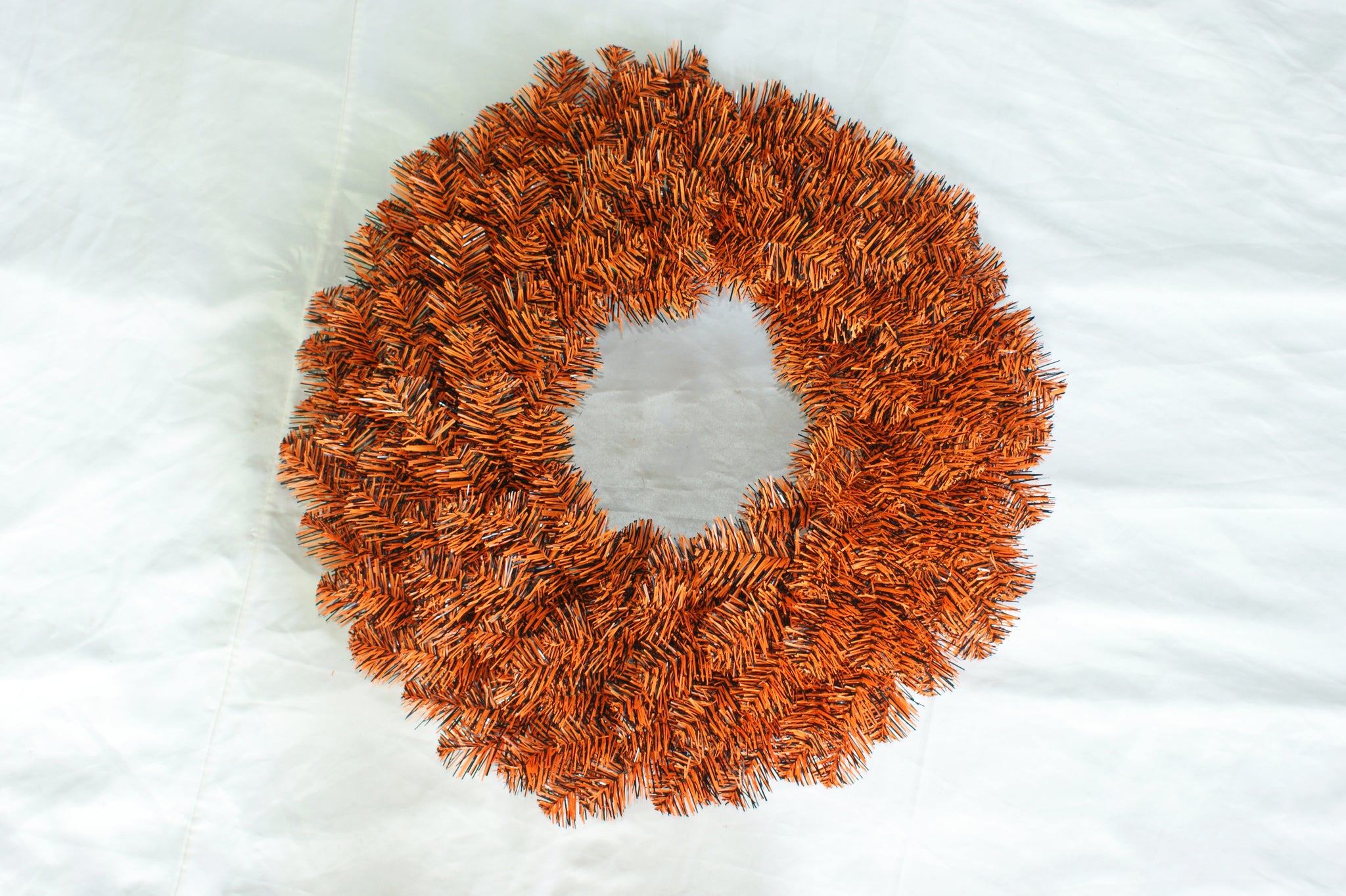 Add a bold pop of seasonal color with this 24-inch Orange & Black Wreath. The vibrant mix of orange and black pine makes it a perfect choice for Halloween displays or unique fall décor. Hang it on doors, walls, or windows to instantly set a festive, eye-catching atmosphere.