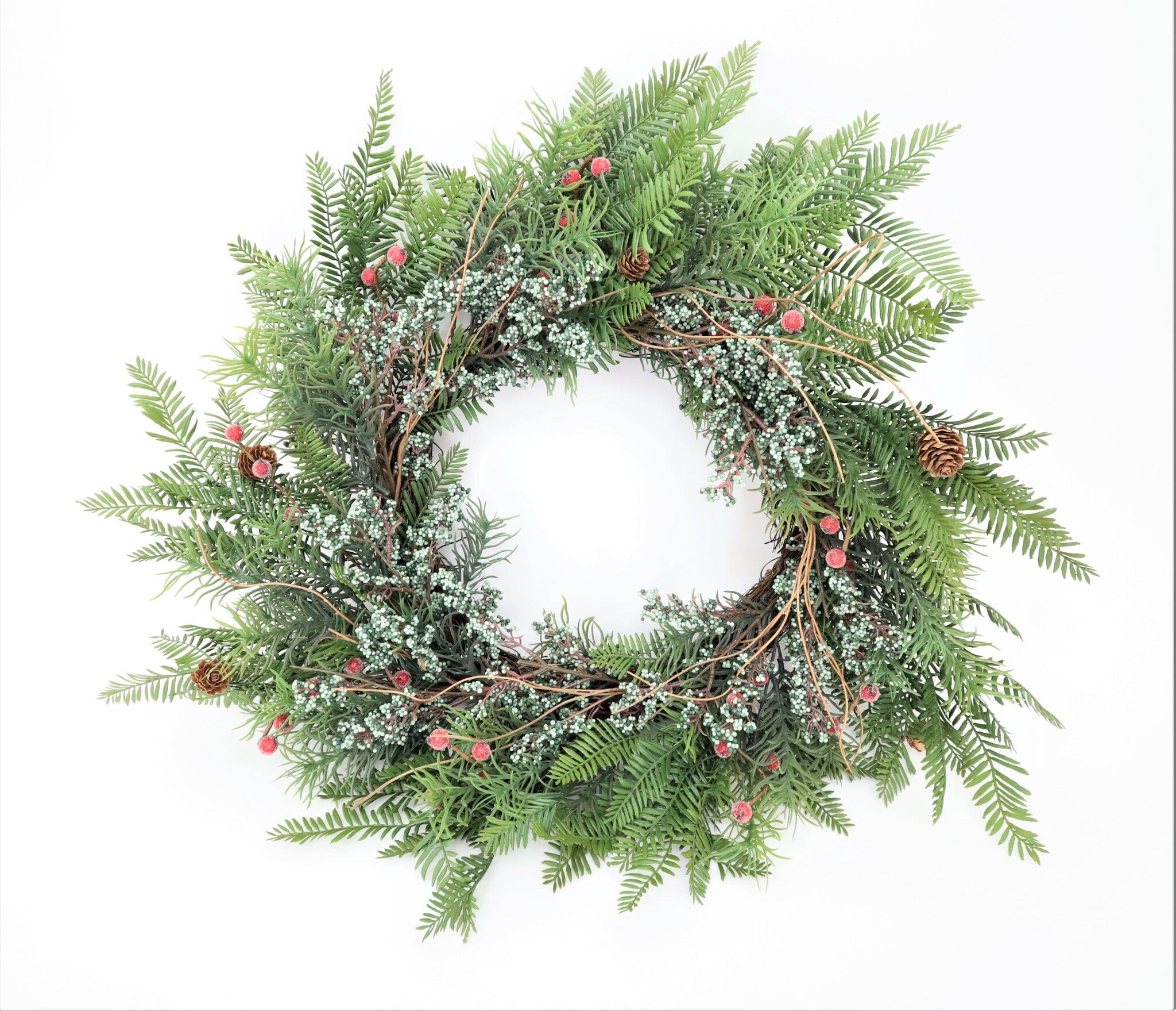 Bring natural woodland elegance to your décor with this 27.5-inch Sago Cycas wreath. Featuring lush green Cycas foliage, intertwined twigs, and accents of frosted berries and pinecones, this design offers a charming mix of rustic and festive. Its organic look makes it perfect for both holiday decorating and year-round display.