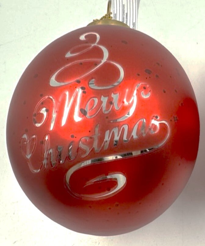 This festive red glass ornament features an elegant silver Merry Christmas script design. A timeless accent that brings holiday cheer and sparkle to your Christmas tree or seasonal displays.