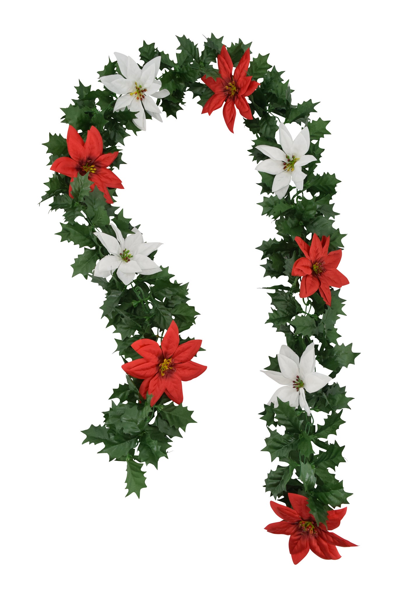 Brighten your holiday decor with this festive 6-foot garland, featuring vibrant red and white poinsettias paired with rich green holly leaves. Perfect for draping along mantels, staircases, or doorways, it brings a classic Christmas touch to any space.