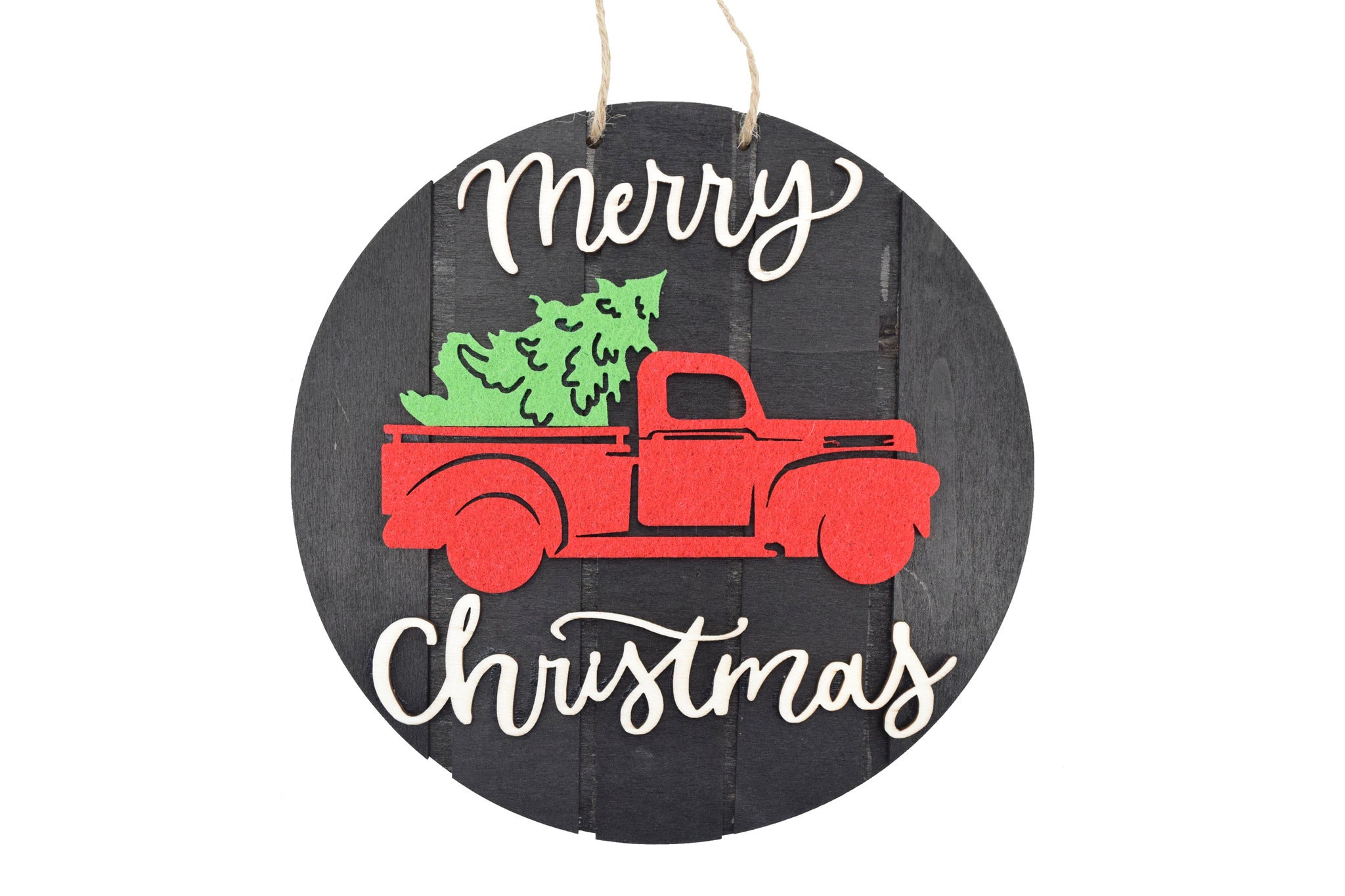 Celebrate the season with this rustic ornament featuring a classic red truck carrying a festive Christmas tree. The round wooden design is accented with Merry Christmas lettering, making it a charming addition to your holiday décor. Perfect for hanging on trees, wreaths, or as a festive wall accent.