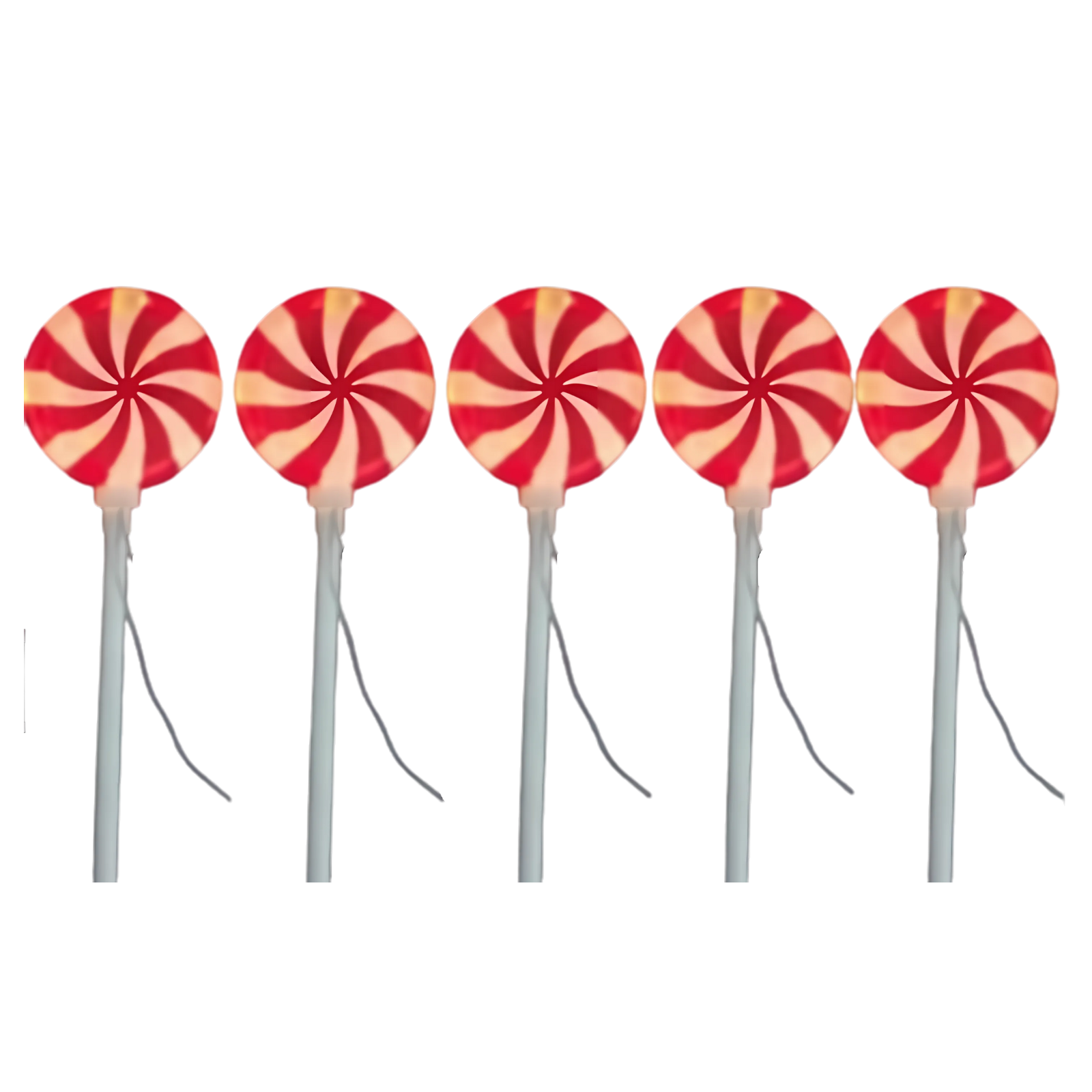 Add sweet holiday cheer to your walkway with this 8-foot set of 5 solar-powered peppermint lights! Featuring classic red and white stripes, these festive stakes charge during the day and glow automatically at night. Perfect for lining driveways, garden paths, or entryways with a bright and jolly touch.