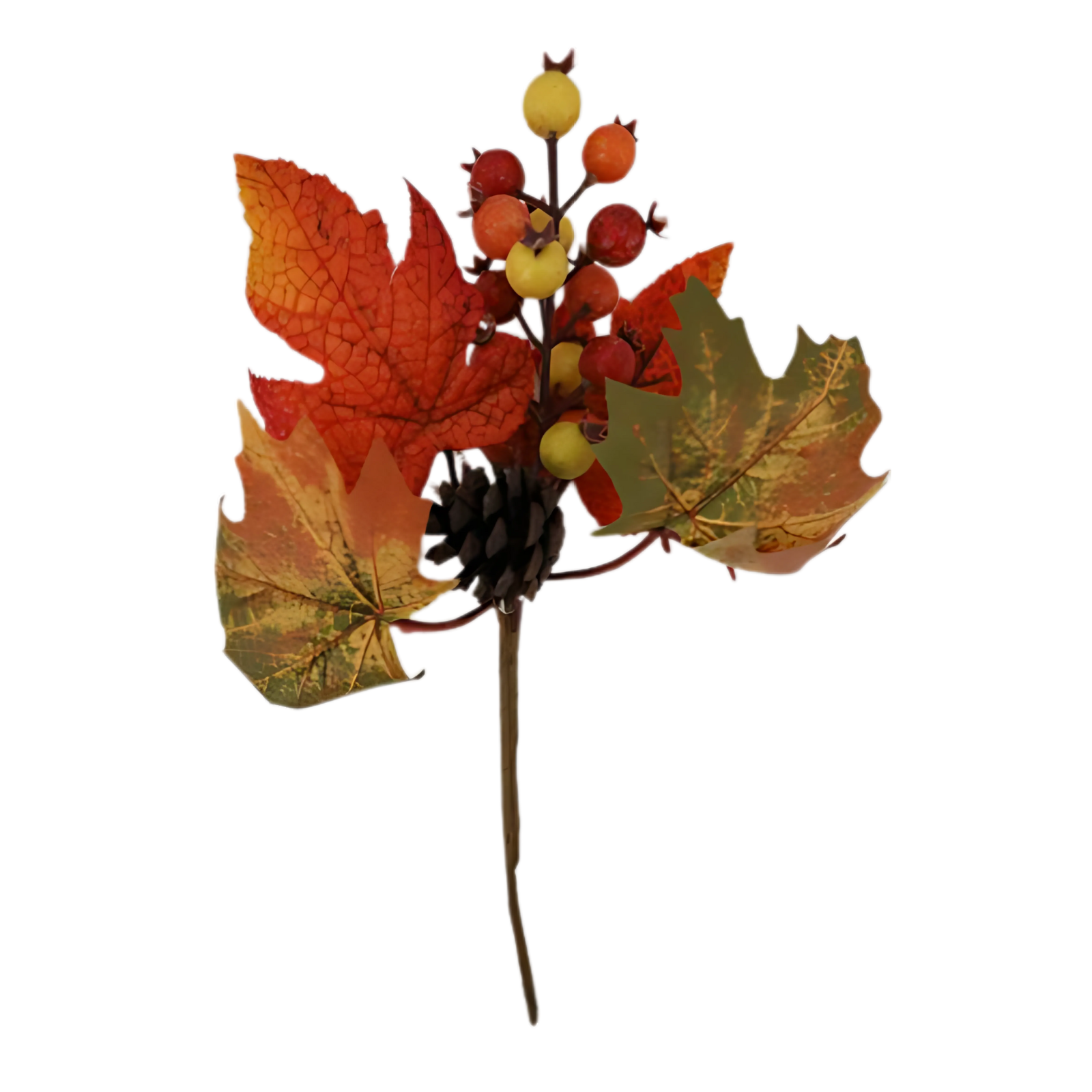 Bring the beauty of the harvest season to your decor with this charming pick, featuring clusters of vibrant berries, a natural pinecone, and lifelike maple leaves in warm autumn tones. Perfect for adding a seasonal accent to floral arrangements, wreaths, or table centerpieces, this piece captures the rustic elegance of fall. Its rich textures and colors make it an easy way to infuse your home with cozy, festive charm.