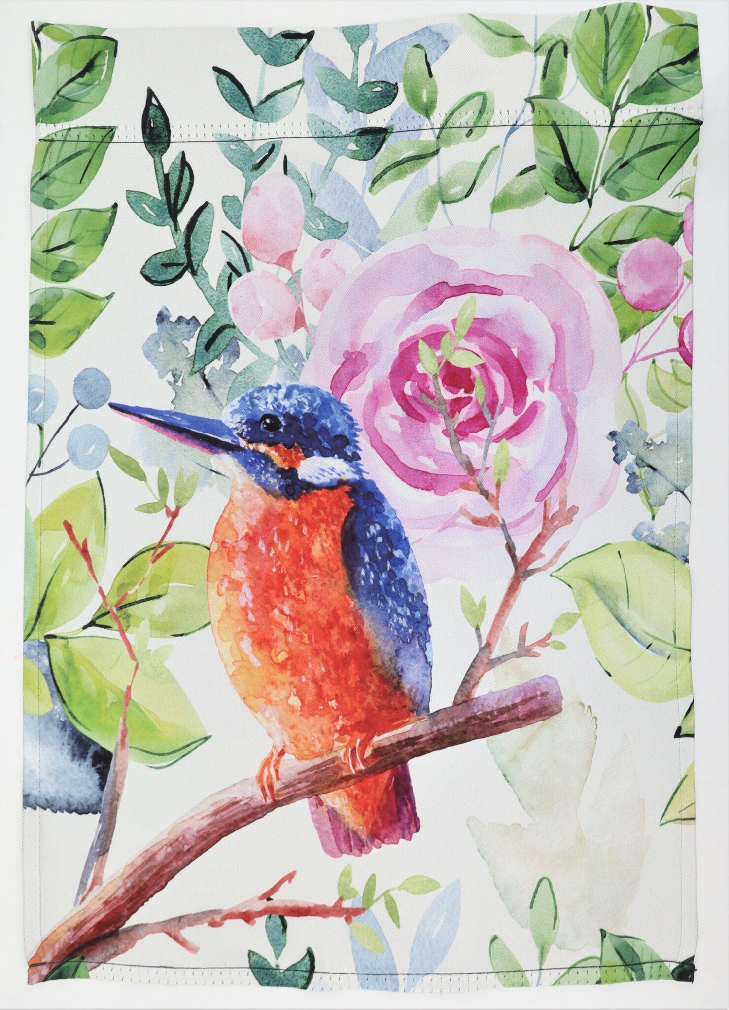 This "Floral Bird Garden Flag" showcases a beautifully painted bird, perched gracefully on a branch, against a lush floral backdrop of pink roses, green leaves, and subtle botanical accents. This vibrant and artistic flag captures the essence of nature and springtime, bringing a touch of elegance and color to any outdoor space.