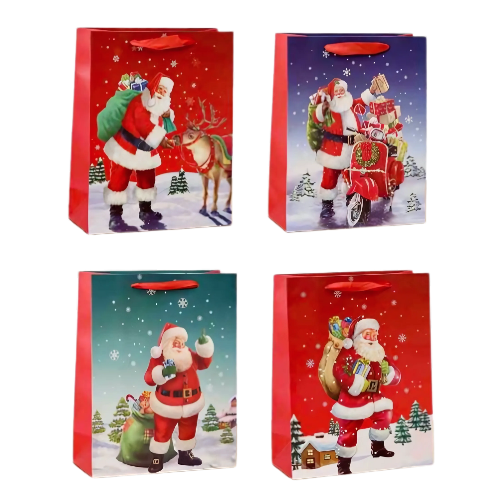 Add festive flair to your holiday gifting with these vibrant Santa-themed gift bags. Each features a unique seasonal design, from Santa with his reindeer to delivering gifts on a scooter, all set against snowy winter backdrops. Sold individually, with a minimum of 4 per order, designs will be assorted.