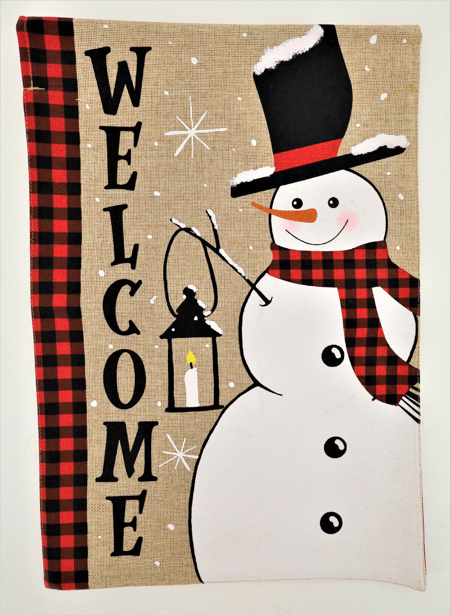 This "Plaid Snowman Welcome Garden Flag" features a cheerful snowman dressed in a classic top hat and plaid scarf, holding a lantern to warmly greet guests. Set against a rustic burlap-style background with snowy details and a festive buffalo plaid border, this flag radiates winter charm and hospitality.